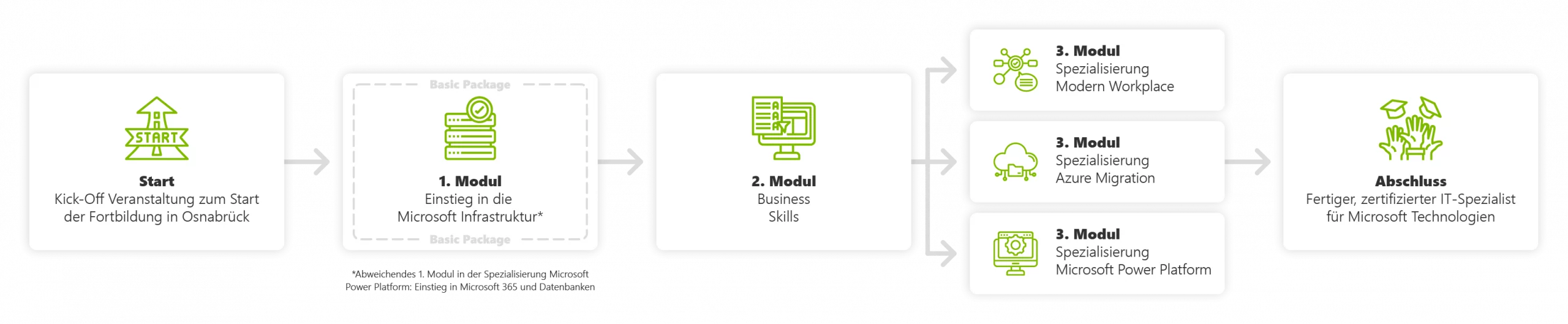 Neben einer Festanstellung bei einem der teilnehmenden Unternehmen begleiten wir Dich über einen Zeitraum von einem Jahr. Sowohl online als auch in Präsenztrainings bei uns in Osnabrück erlernst Du die Konzeption und Umsetzung anspruchsvoller und praxisorientierter Projekte. Dabei legen wir großen Wert darauf, Dir genau die Fähigkeiten beizubringen, die Du für die Umsetzung von Modern Workplace, Microsoft Cloud oder Prozessautomatisierungs-Projekten in der Praxis benötigst.